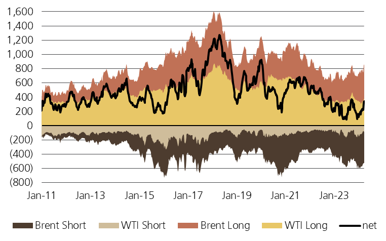 Next, while I have kept a close eye on COT reported positioning in the past, my approach of looking across WTI and Brent ended up being misguided. Additionally, while looking at WTI positioning of managed money (MM), I over-emphasised the low levels of long positioning against historical levels vs paying attention to the relative positioning of Longs/Shorts.