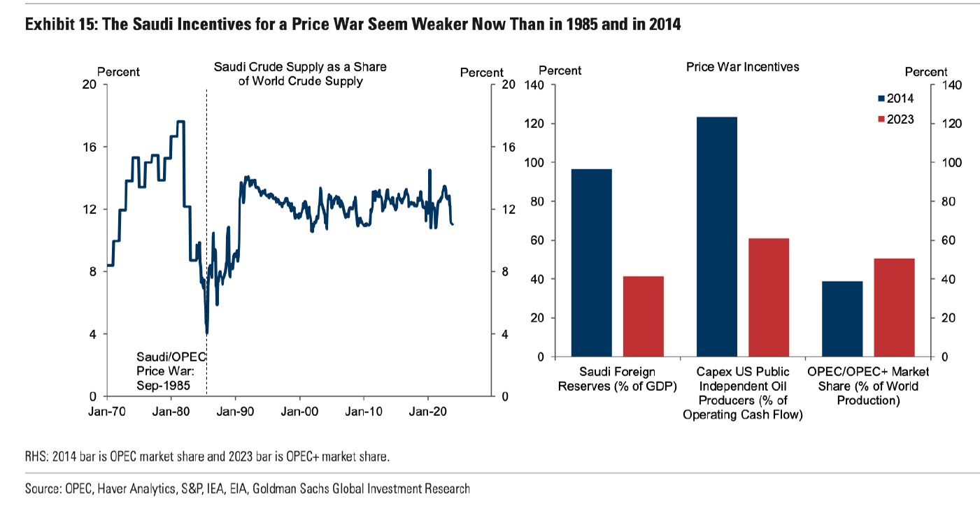 See below from Giovanni Staunovo (data through 3/26 shown) with Brent short positioning remaining at a historically substantial level. I can only theorize this large positioning of shorts represents some macroeconomic hedge from risk parity funds that started in size as we entered 2023, what was supposed to be a recession year. The question is, with the economy relatively stable and oil prices + inflation potentially bottoming, does this trigger Brent short positioning covering?