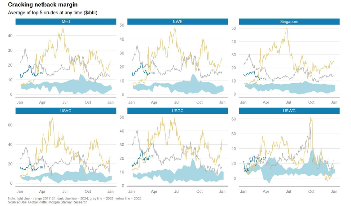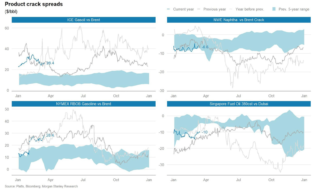 Refinery margins and product crack spreads have come off their near-term bottoms in December and remain constructive of the positive demand scenario this year. However, looking at Singapore cracking margins and fuel oil spreads, there are some recent pockets of weakness in the East worth monitoring.