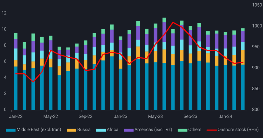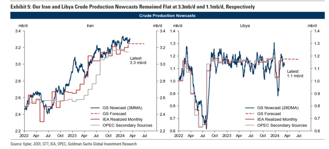 OPEC+ exports, outside of KSA, have averaged much higher than what would be expected under full compliance based on guided cuts (above). All the while, Iran has been rapidly increasing production and a normally volatile Libya has been consistently above 1Mbpd (below).