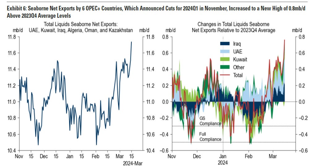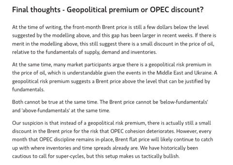 On the geopolitical front, I think Morgan Stanley nailed the crude price impact in their observations from a note earlier in March (below). They argued that there was no geopolitical premium in crude and, in fact, suspected an OPEC quota cohesion DISCOUNT in the price of crude. Drone strikes on Russian refineries, recent OPEC+ cut extensions and commitments to “catch up”, and Iran/Israel tensions appear to have rapidly swung us the other way back toward premium the past two weeks. This recent geopolitical premium injection is likely exacerbating the mechanical move of the paper-fueled rally in flat prices driven by speculators.