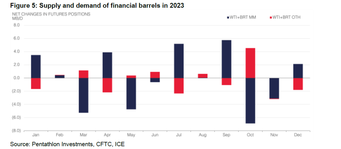 The reason to fade the CTAs at the extremes of relative positioning is apparent as the peaks and valleys of net positioning mark generally mark highs/lows of the market and a followed by sharp price moves. As Dr. Ilia illustrates below the speculative selling or buying by Managed Money (MM) can totally overwhelm any physical tightness or weakness, as well as, other noncommercial speculative participants (OTH). This is precisely what happened in Oct ‘23 as algorithmic selling triggered ~7Mbpd of financial selling that simply overwhelmed a physical OPEC cut of 1-2Mbpd. The move to the downside was likely accelerated by the uneasiness of the bond market at the time before Yellen stepped in with a shift in treasure issuance.