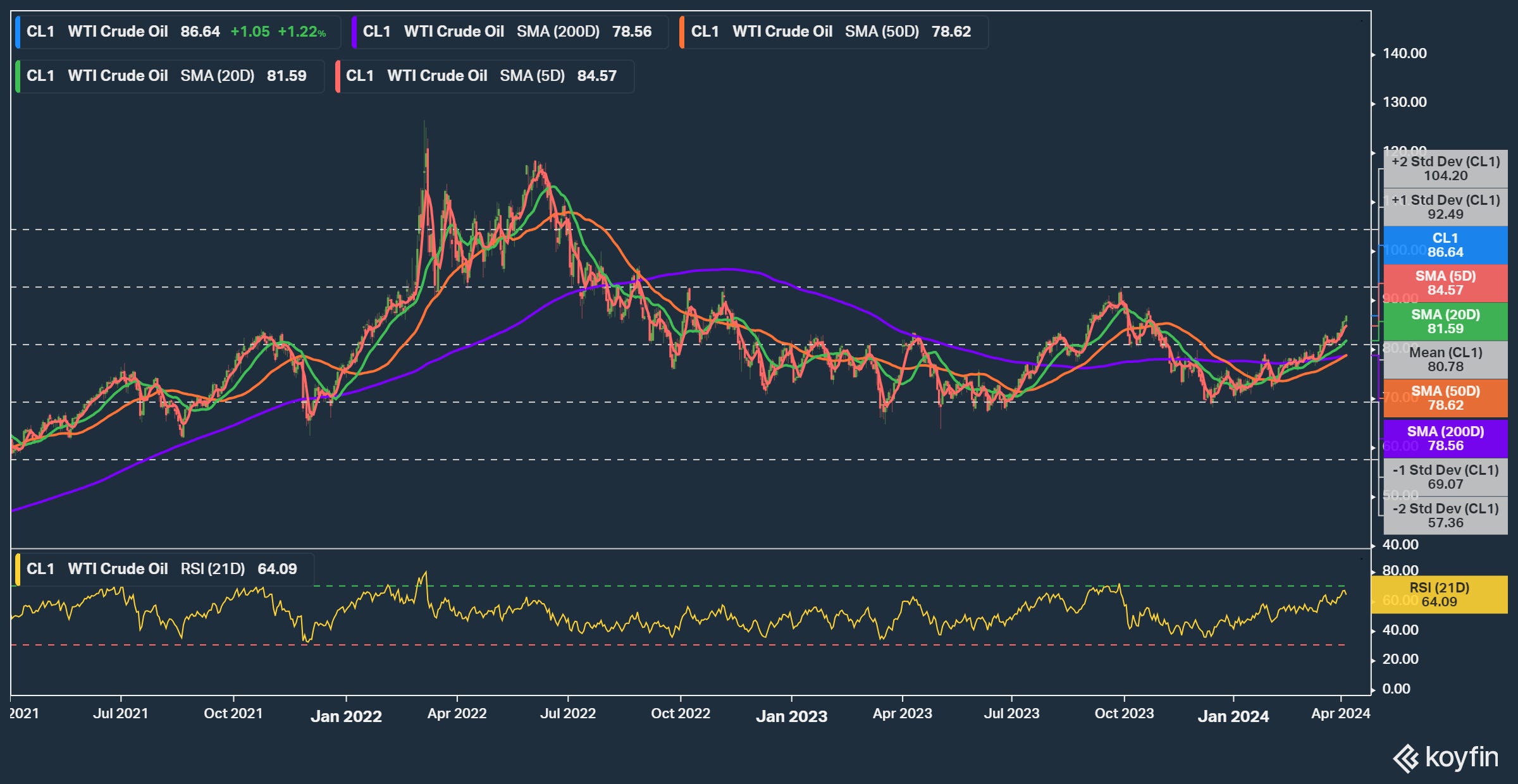 Starting with a silver lining. From a technical perspective, my observations of flat prices and momentum provided one good signal. And, similar to last year, we’ve seen a firm retake of the 3-year mean. This has shifted my probability higher of a move to the current +1 Std dev price of $92.53 WTI before the summer with the projected crude draws and firm fundamentals into Q3 ‘24. The 50d SMA has crossed above the 200d SMA, providing a powerful technical signal to speculators on the direction of the market as well. But, what I needed was a better understanding of what was driving flat prices higher or lower outside of perceived fundament factors and a systematic signal with more inputs.
